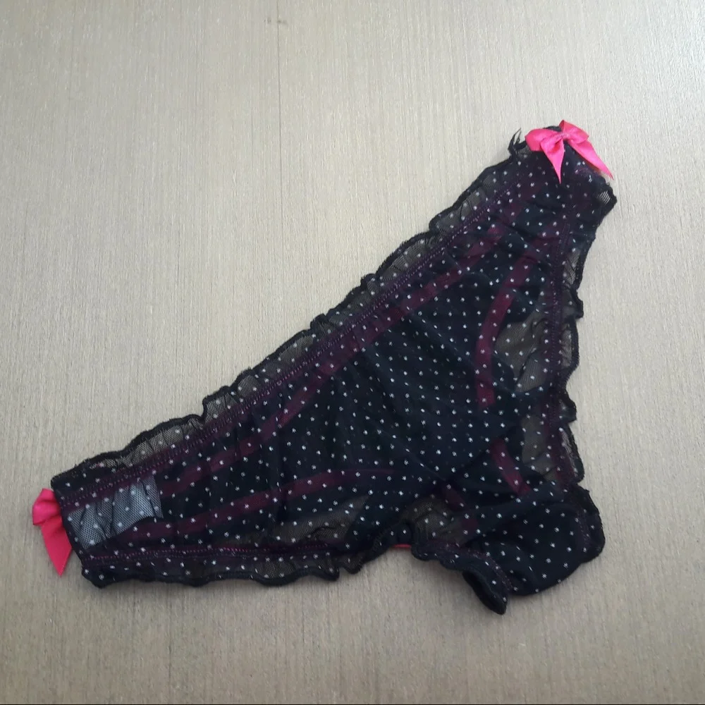 - Calcinha confeccionada em tule estampado em detalhes poá. Modelo une delicadeza e conforto. O lacinho em cetim nas laterais adicionam ainda mais delicadeza à peça.
